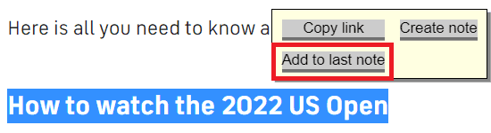 When you press the “Add to last note” button on the popup that appears when you select text on a web page…